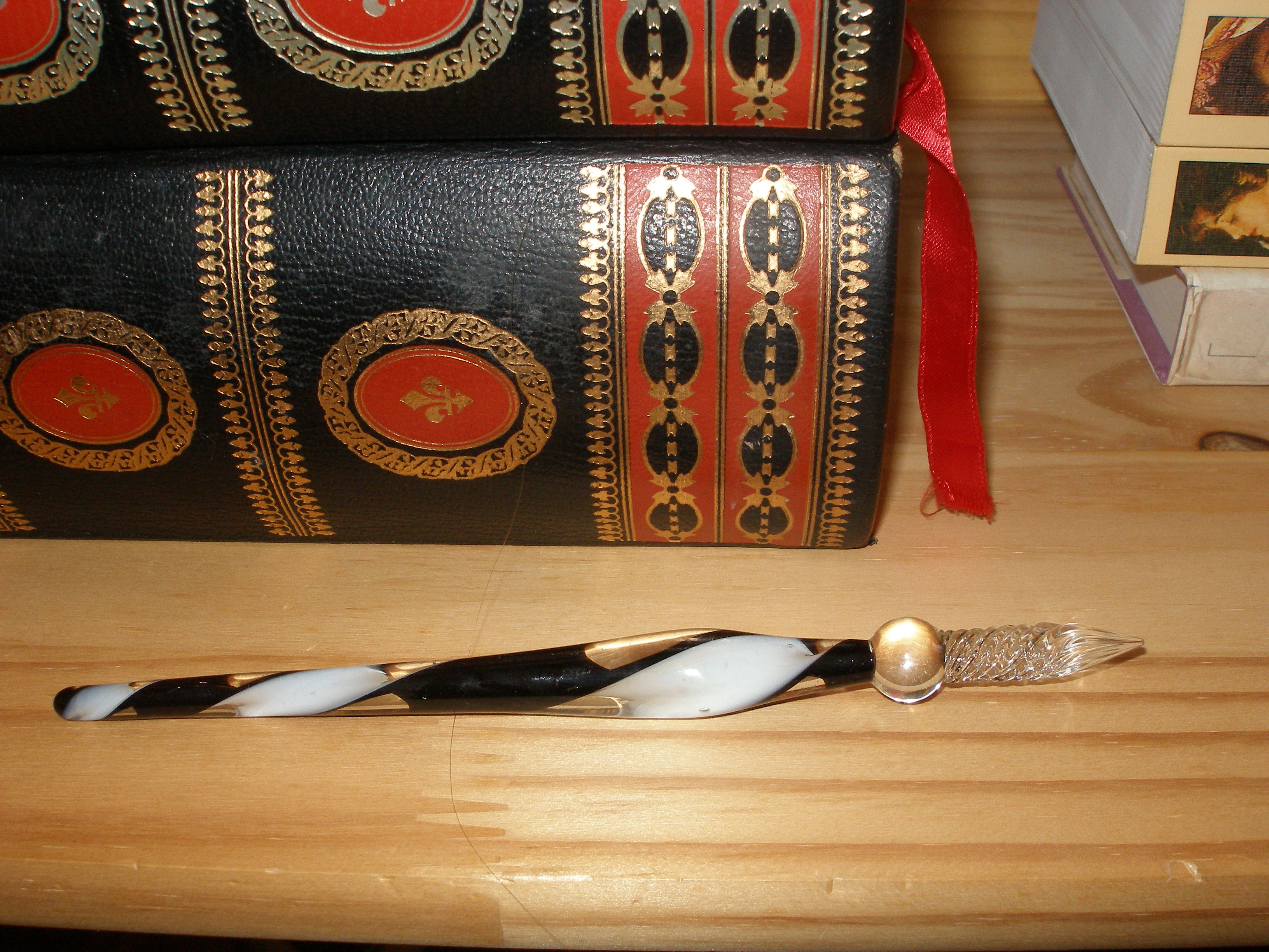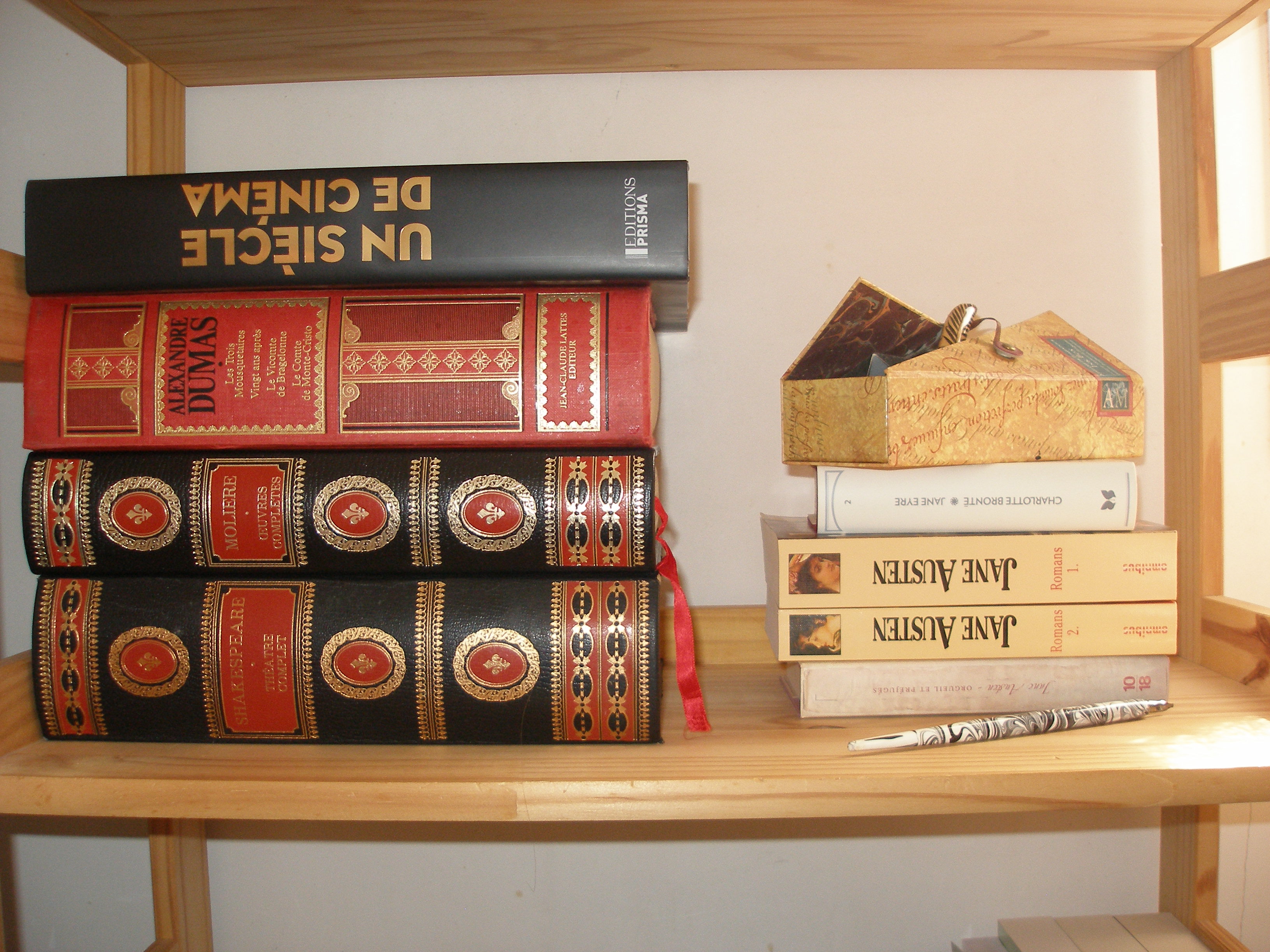 Étagère avec mes livres anciens, mon livre de cinéma et quelques classiques ainsi qu’une magnifique plume en verre achetée au Château de Versailles.