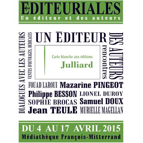 Ce mois d’avril voit le lancement des éditeuriales à Poitiers (86), un salon du livre innovant présentant une maison d’édition et ses auteurs. Pendant deux semaines, différentes conférences suivies de séances de dédicaces, présentent le fonctionnement de la maison d’édition Julliard, ainsi que leurs auteurs, leurs livres et leurs modes d’écriture.