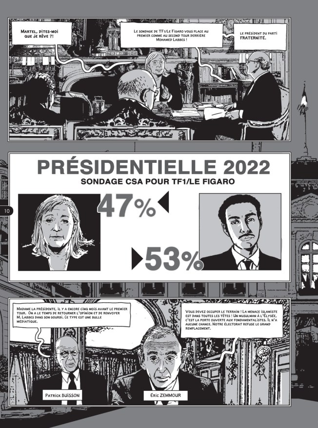 Les dessins sont toujours en noirs et blancs, donnant véritablement un caractère documentaire car chaque visage est admirablement reconnaissable. Une bande-dessinée qui en dit long sur le programme de ce parti et qui ce conclu d’une manière inédite. Un genre particulièrement marquant, en faisant intervenir des figures importantes de notre paysage social les auteurs nous ancrent dans ce que pourrait être demain.