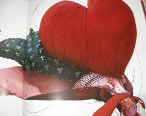 Les personnages sont comme des pantins qui se modèlent au fur et à mesure que les enfants énoncent ou questionnent ce qu’est pour eux un amoureux. Les illustrations donnent cette impression de mouvement, presque de flottement dans l’air un peu comme lorsqu’on est nous-même sous l’effet de ce sentiment. J’aime cette adéquation de la forme et du sujet qui donne une profondeur à l’album. La couleur dominante est le rouge avec toutes sortes de déclinaisons : du rose pâle au rouge carmin, par les vêtements des personnages ou leur accessoires et jouets.
