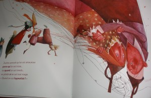 De plus la lecture est double car un adulte peut le lire, le sourire aux lèvres et un petit air de nostalgie en se disant que oui, être amoureux c’est tout cela et un enfant aura cette découverte fabuleuse et l’impression de toucher du doigt quelque chose que les grands connaissent et leur donnera une importance. Le texte de Rebecca Dautremer est simple mais donne de vraies réponses et conviendra parfaitement à des enfants qui ont beaucoup d’interrogations.