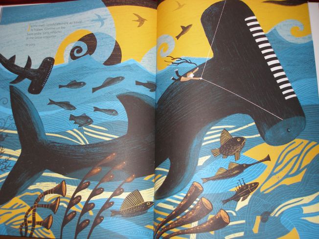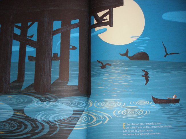 Les illustrations dans des teintes bleutées développent l’univers du rêve et de l’évasion. L’enfant vogue dans les eaux d’une mer imaginaire, faisant la rencontre de baleines et de requins marteaux majestueux.