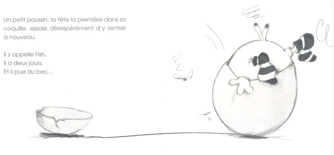 Fish est un petit poussin qui au bout de deux jours à l’extérieur souhaite re-rentrer dans sa coquille, car le monde ne lui paraît pas joli-joli et en plus il pue du bec ! Mais sa maman lui montre que la vie vaut la peine d’être vécue parce que les choses les plus précieuses ont besoin de temps pour être découverte. Les mamans sont toujours là pour couver leurs petits quand ils en ont besoin.