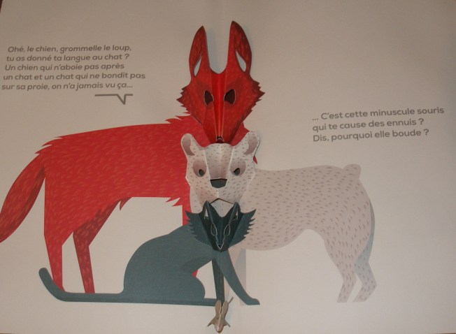 » Un grand album pop-up qui raconte l’histoire d’une petite souris qui boude depuis que le jour s’est levé. Un chat l’approche et se formalise de la voir faire la moue. Ça lui coupe même l’appétit, dit-il. C’est maintenant au tour du chien, de faire son entrée et d’essayer d’obtenir auprès du chat les raisons de cette bouderie entêtée. Sans plus de succès… Puis vient le loup, puis l’ours. Tous oublient leurs querelles devant la mine renfrognée de la souris »