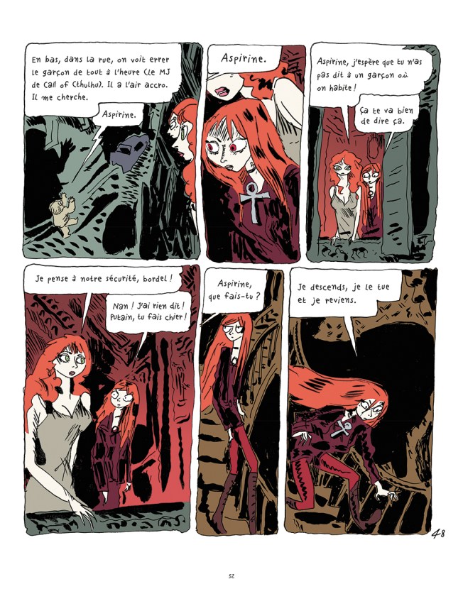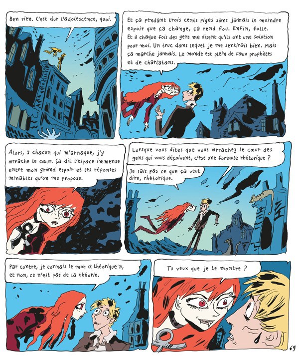 Avec son coup de crayon reconnaissable, fait de traits droits et acérés, Joann Sfar nous propulse dans un univers fait de références à la culture pop et fantasy. Allant de la vivacité endiablée d’une danse entre sœurs, à la solitude d’un wagon de métro ou d’un cours de philo que l’on suit du coin de l’œil, Sfar nous montre toute l’étendue et l’ambivalence d’une vie adolescente. On en oublierait presque qu’Aspirine est une vampire et c’est là la force du récit.