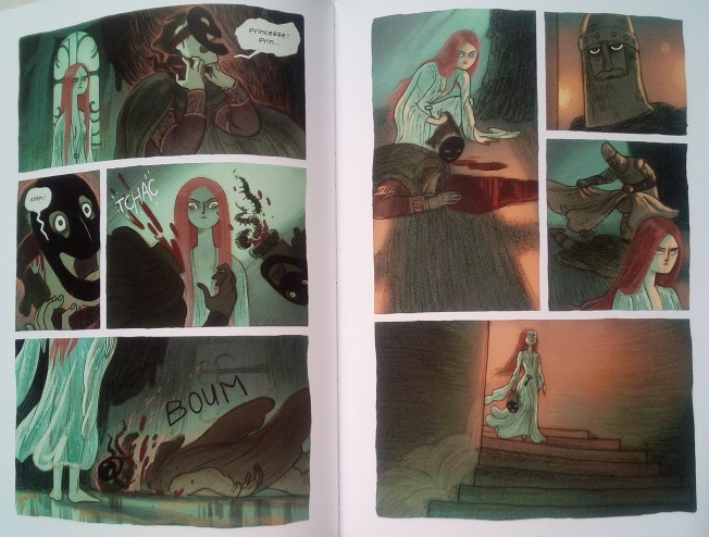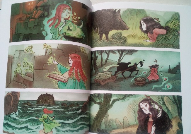 Peu de dialogues, la place est laissée aux illustrations sur de grandes planches aux couleurs sombres dans des multiples nuances de vert et noir. La magie y est savamment dosée avec des touches de violences, donnant aux dessins ce petit quelque chose de terrifiant et fascinant à la fois dont les enfants sont friands. Car c’est bien là le plus de cette BD, elle convient aux adultes amateurs de légende comme aux enfants dès l’âge de 7 ans, que les histoires un brin horrifiques vont faire frissonner sous la couette en cette saison !