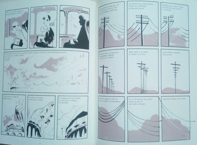 Le dessin est tout en détail, donnant à voir tout le génie de Duchamp à l’œuvre. Le dessinateur est véritablement entré dans l’univers de l’artiste en donnant dans ses planches le trait aérien propre à Duchamp. C’est assez significatif notamment lorsqu’on regarde Nu descendant un escalier où tout le corps est déstructuré pour restituer le mécanisme du mouvement. Nous retrouvons un peu de cette inspiration dans le dessin de Roman Muradov, très détaillé, pas abstrait comme chez Duchamp mais fin et descriptif comme celui du maître du ready-made.