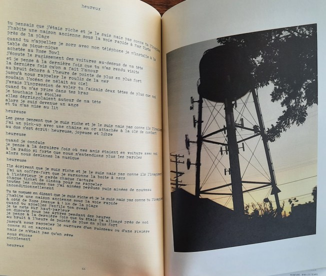 Tapés sur une machine à écrire, les poèmes sont présentés dès leur premier jet, avec les ratures, les ajouts et les corrections, ce qui donne une impression plus intime encore. Agrémentés de photos couleurs prises par l’artiste elle-même de paysages, floutés artistiquement, dans des raies de lumière ou des images en noir et blanc extraites d’archives représentant une vie américaine, ce recueil est comme un journal intime.
