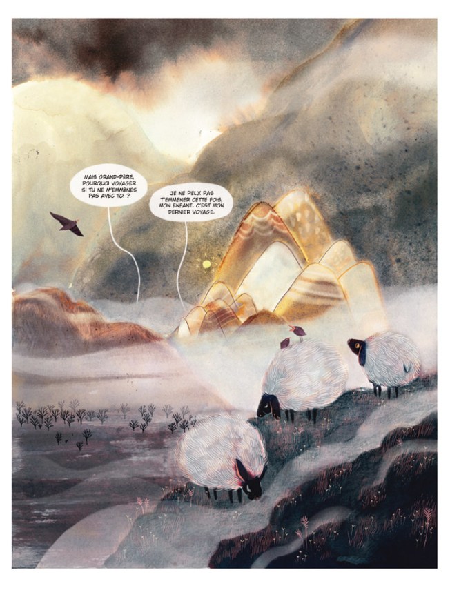 » Grand-père et l’enfant aiment voyager. Ensemble, ils ont parcouru le monde. Mais grand-père ne peut plus avancer, les montagnes qui ont poussé sur son dos tout au long de sa vie sont devenues trop lourdes aujourd’hui.