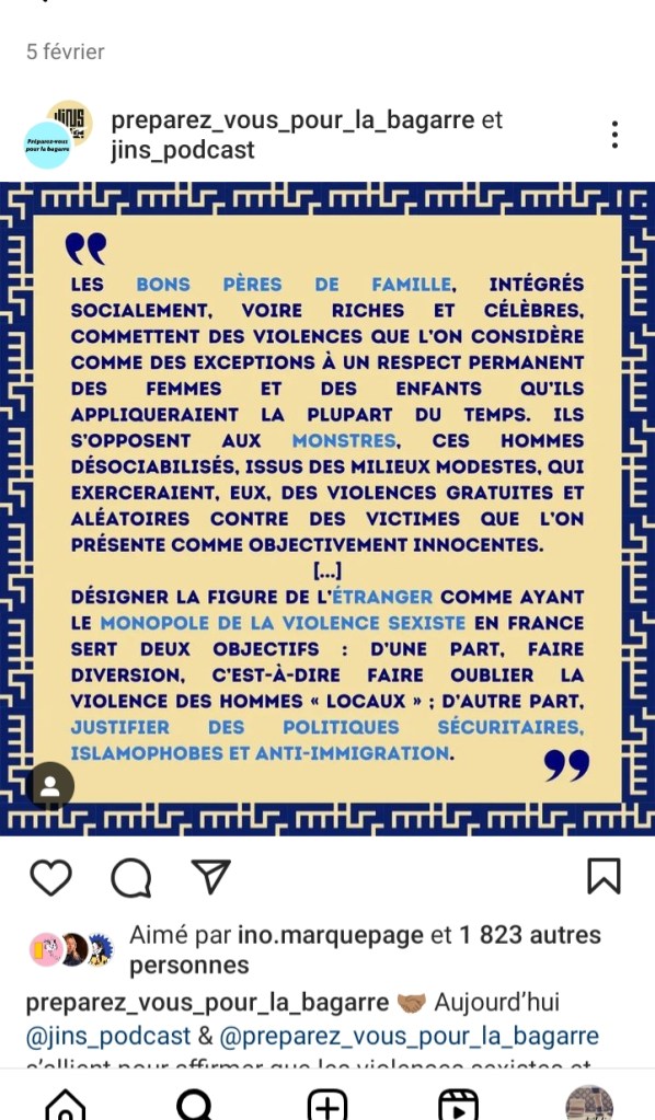 Le patriarcat est pernicieux et tenace car circule encore et toujours l’image du violeur des parkings la nuit ou celle du monstre étranger. Mais non, les hommes violents sont connus des victimes dans la plupart des cas, alors pourquoi violence et famille est un sujet si tabou…